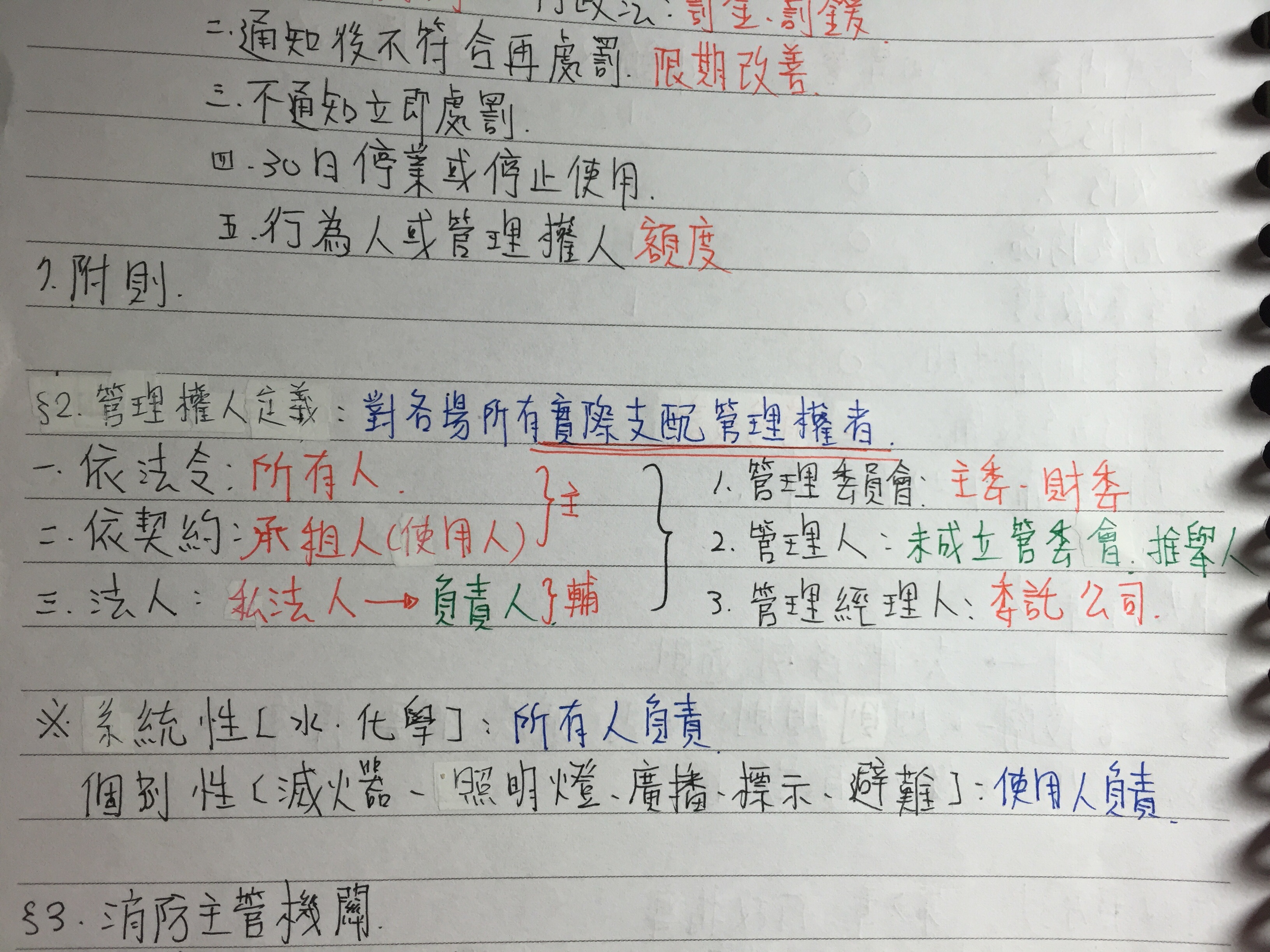 一、消防法第二條,管理權人系指依法令或契約對各該場所有實際支配管理權者;其屬法人者,為其負責人。