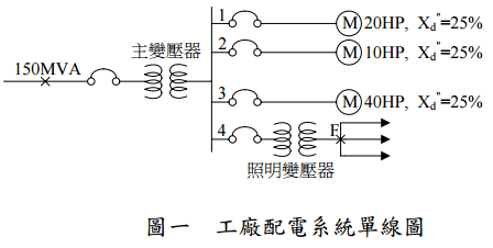 四、某工廠配電系統如圖一所示,一次側短路容量:150 MVA,主變壓器:380/220 V, 200 kVA,X=5%,照明變壓器:220/110~190 V,20 kVA,X=3%。試求: