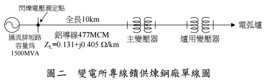 五、圖二所示為變電所專線饋供煉鋼廠之單線圖。其中煉鋼用電弧爐 30 噸,主變壓器 及爐用變壓器之容量均為 12.5 MVA,其電抗分別為 8%及 7%,電弧爐及其引線等 之總電抗為 30%。該煉鋼廠以三相 69 kV 受電。設線路採用每公里阻抗為 0.131+j0.405Ω 之 477 MCM 之鋁導線,變電所至煉鋼廠之距離為 10 公里,已知電 源側匯流排之短路容量為 1500 MVA,試求:
