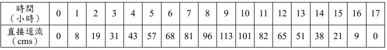 四、已知一集水區的集水區面積 100 km2 ,在某一次有效降雨延時為 1 小時的直接逕流歷線如下表所示: