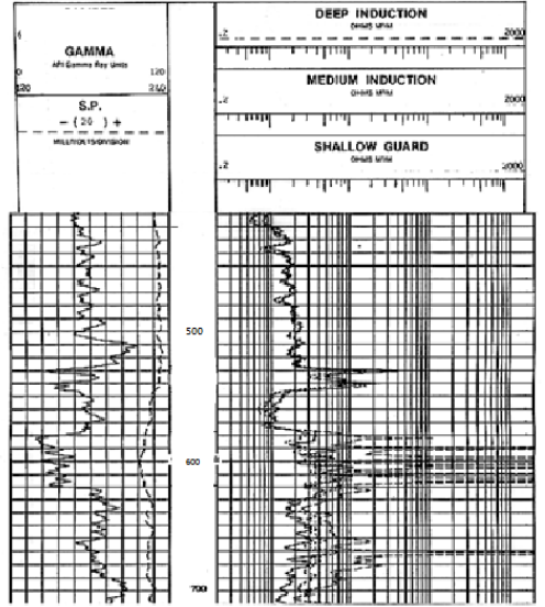 三、在石油探採的過程中,幾乎在每一個鑽井都會施作井下電測,進行電測解釋。下圖是幾種電測合在一起的電測圖。請回答下列問題: