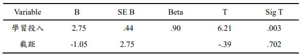 三、某教育學者想知道「學習投入」(單位:小時)是否具有預測「學業成績」(單位: 分)的效用。他根據資料分析結果,獲得下列報表:試問:(每小題 5 分,共 25 分)