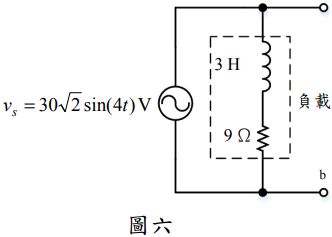 四、如圖六所示的交流電路,負載由一個 3 H 電感與一個 9 Ω的電阻組成,接到電源 vs, 求: