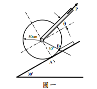 ⑴若拉力P與斜面成θ = 30°,試 求使輪子恰能脫離斜面A點開始越過擋塊所需之P。(12 分)