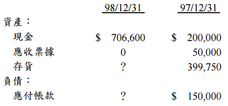 乙公司對所有營業費用均以現金付款,而所有進貨則採賒購方式。98 年間共償付 $943,400 應付帳款,同期間之營業費用總計為$440,000,所有的銷貨均為現銷;為 維持存貨水準,每月均進貨 1,500 單位,且採用先進先出法定期盤存制。98 年 1 月 份的存貨單位成本為$65.2,且在 98 年間單位成本每月增加$0.2,而所有銷貨的單 位售價則為$100。97 年期末存貨的單位成本為$65。 試作:
