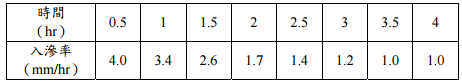二、某地入滲試驗測得之入滲資料如下表所示: 假設初期入滲率