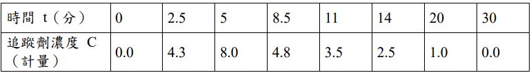 四、一非理想反應器經由脈衝追蹤劑(pulse tracer)實驗獲得其濃度與時間的關係如下表: