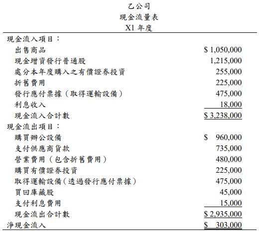 林君認為,乙公司 X1 年度現金淨增加$303,000 代表 X1 年度經營表現極好;李君 則認為乙公司 X1 年度之經營結果並不理想,除現金流量表表達方式不正確外, $303,000 亦非正確的現金增加數。 試分析: