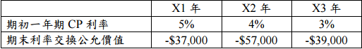 三、本題假設 CP(商業本票)浮動利率合乎國際會計準則第 39 號之基準利率定義。 X1 年年初甲公司平價發行 5 年期浮動利率公司債$1,000,000,票面利率為一年 期 CP 利率+3%,每年年底依當年年初之一年期利率付息。該公司希望將利率 鎖定為固定利率,於是在發行公司債之同日另簽定付 5%固定利率且收一年期 CP 浮動利率之零成本利率交換,此利率交換之名目本金為$1,000,000,期間為 5 年,收付息日與公司債相同。不考慮所得稅之影響。X1 年、X2 年及 X3 年交 換合約相關資料如下: 試作: ⑴請分別回答 X1 年、X2 年及 X3 年下列各項目之金額:(12 分)