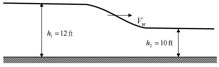 五、寬廣渠道中一斜升波(Monoclinal rising wave)以波速 Vw向下游推進,已知上下游 水深分別為 12 ft 與 10 ft,曼寧係數 n = 0.015,渠床坡度 S = 0.0002,試求: