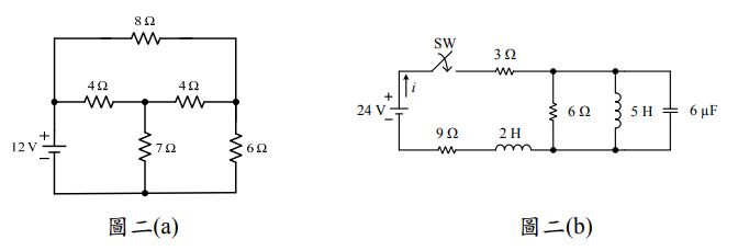 ⑵如圖二(b)所示之電路,將開關SW閉合後,且達穩態時,求總電流 i 為多少?(10分)