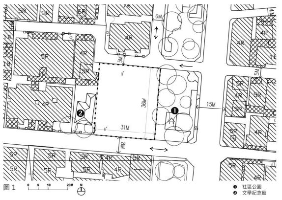2.基地略呈方形,南北兩側為巷道,東臨社區公園,公園外側為街道。基地西面為 一日式的歷史住宅建築,近年修復成為一文學紀念館,並對外開放(見圖 1)。