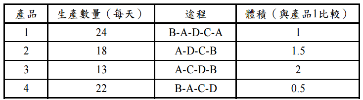 四、丙公司在生產設施內製造四種產品,此設施具有 A-D 四個部門。每一產品相關的生 產數量、途程資訊及體積如下表所示。
