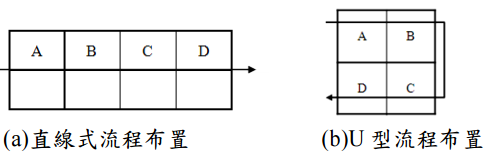 圖(a)為直線式流程布置,而圖(b)是 U 型流程布置。從 A 至 B 的距離是 20 單位,從 B 至 C 的距離是 20 單位及從 C 至 D 的距離是 20 單位。對圖(b)布置而言,從 A 至 C 的 距離和從 B 至 D 的距離相同(相反方向亦同),從 A 至 D 的距離為 20 單位,以部 門的布置型態所形成的三角形之斜邊距離為準。