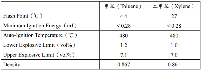 五、某作業場所主要生產甲苯(Toluene)及二甲苯(Xylene)如附表,此作業區域被認 定為 Zone 0 區域,以此條件回答下述問題: