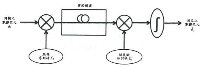 五、下圖所示為一展頻(spread spectrum)通訊傳輸系統概念圖。傳輸端之數據位元 經過序列碼 展頻調變後饋入傳輸通道,接收端則利用相對應之序列碼 對傳輸通道 過來的展頻信號進行解展頻解調變以回復接收之數據位元: