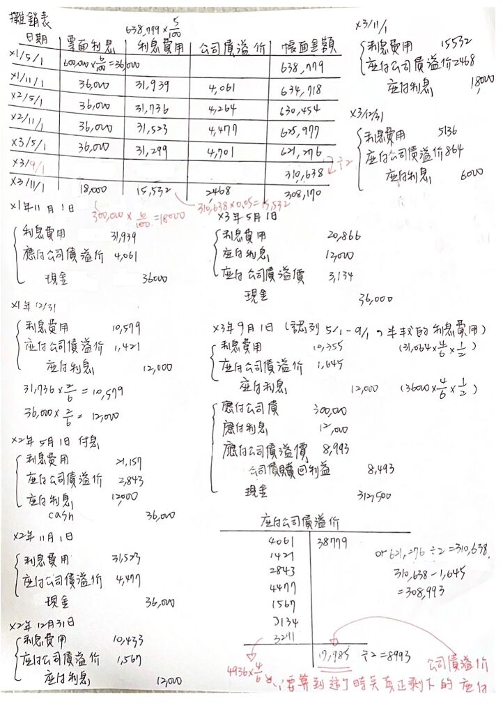 三、甲公司於 X1 年 5 月 1 日發行面額$600,000、票面利率 12%,4 年期的公 司債,付息日為每年 5 月 1 日與 11 月 1 日,發行時市場有效利率為 10%。 甲公司的公司債採用攤銷後成本法,並以有效利率法攤銷折溢價。X3 年 9 月 1 日,甲公司以$312,500(含應計利息)買回面額$300,000 之公司債。