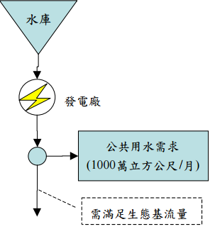 五、若有一水庫需滿足尖峰發電、生態基流量與公共用水需求三種標的,其系統調配圖 如下圖所示。若當月可用水量高於發電規線時,其供水必須滿足尖峰發電量 9.8×10
