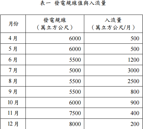 瓦(單位為N.m/sec),若當月可用水量低於發電規線時,則以滿足公共用水需求量 與生態基流量為主,水庫之發電規線詳見表一。水庫基本資料與公共用水需求量如 表二所示。假設不考量發電中間過程之損失,且水庫水位與發電機組間可以固定落 差(50 公尺)近似之,且: