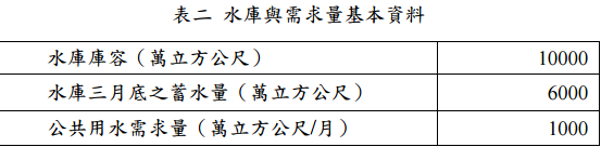 ⑵試求 4 月及 5 月之水庫放水量與蓄水量。(10 分) 水庫 公共用水需求 (1000萬立方公尺/月) 需滿足生態基流量