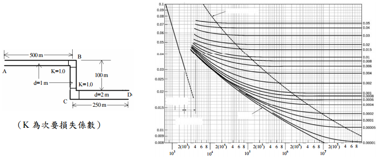 二、如下左圖,管子都處於同一平面(不用考慮重力),管子中以穩態流動的水自 A 點 流到 D 點損失 2 m 的水頭,若管子斷面為正方形(圖中 d 為邊長),表面粗糙度為1 mm。(25 分)