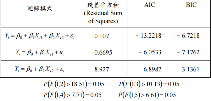 ), i =1,Κ ,5,我們試著以不同的迴歸模式來分析,並希望 利用不同的方法選取適合的迴歸模式。以下為可能用到的迴歸模式以及統計量: