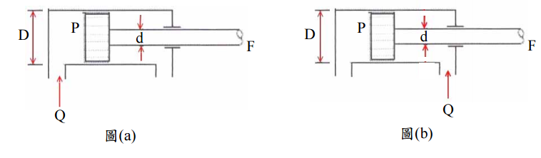 五、如圖(a)、(b)所示的油壓缸,假設進入油壓缸的流量為 Q,油壓缸內徑為 D,活塞桿 直徑為 d,作用於活塞上的壓力為 P。試推導