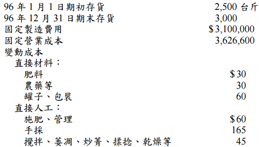 假設所有其他資料不變,計算存益公司 96 年達到損益兩平點的最低銷售數量(以台斤為 單位):