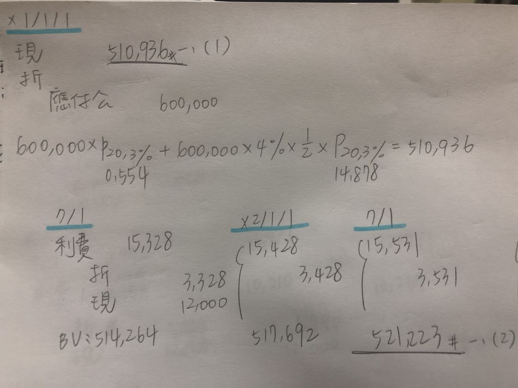 X1/07/01的利息=510,936*0.06/2=15,328 付現利息=600,000*0.04/2=12,000 折價攤銷=15,328-12,000=3,328 X2/01/01的利息=(510,936+3,328)*0.06/2=15,428 付現利息=600,000*0.04/2=12,000 折價攤銷=15,428-12,000=3,428 X2/07/01的利息=(510,936+3,328+3,428)*0.06/2=15,531 付現利息=600,000*0.04/2=12,000 折價攤銷=15,531-12,000=3,531 X2/07/01的帳面金額=510,936+3,328+3,428+3,531=521,223