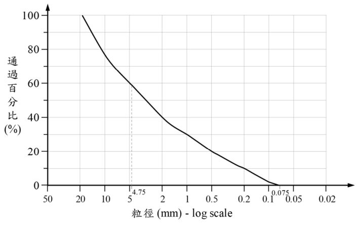 (三)承(二),請根據統一土壤分類法(Unified Soil Classification System, USCS)之相關準則,判斷此土樣屬於良好級配(well graded)或不良 級配(poorly graded)之何者,並決定此土樣之分類符號(雙字母) (須述明研判準則) 。