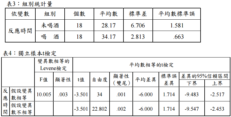 四、交通單位為宣導酒後不開車、開車不喝酒,於是想以科學證據勸導車輛駕駛人,宣 導小組從有喝酒習慣的駕駛人中隨機抽樣38人,再隨機分派為兩組,其實驗處理為 一組喝酒、一組未喝酒,再比較二組的反應時間差異。經初步統計分析後,結果如 表3及表4。(每小題10分,共30分)