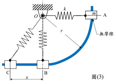 三、如圖(3)所示,一以彈簧 k 連結之 5 kg 質量塊 m,沿固定於機架且半徑 r = 360 之軌道 ABC 無摩擦滑下,當 m 於水平位置 A 處時,彈簧剛好處於未被拉伸狀態。 試回答: