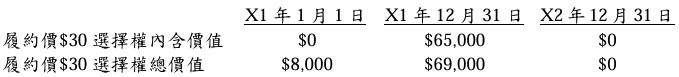 (二)X1 年 1 月 1 日,甲公司為規避乙公司普通股股票價格自$30 下跌至$20 之風險,因而對同一對手在同一合約中,買入及賣出下列兩個選擇權:買入 乙公司股票之賣權,支付權利金$8,000,標的資產為 5,000 股之乙公司普通股, 履約價格為$30;賣出乙公司股票之賣權,收取權利金$1,000,標的資產為 5,000 股之乙公司普通股,履約價格為$20。前述兩個以現金淨額交割之選擇 權到期日均為 X2 年 12 月 31 日。避險有效性係以乙公司普通股投資之公允價值變動與選擇權內含價值變動之比較作為評估基礎(指定以內含價值作為避險工具),前述兩個選擇權相關之價格資訊如下表所示:
