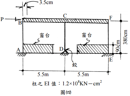 四、圖⑷所示 RC 結構,假設樑 BCF 及窗台皆為剛體(rigid body),且窗台與柱構造上 連結在一起。各柱之 EI 相同。此結構在地震力 P 作用下,樑 BCF 產生水平位移 3.5cm,