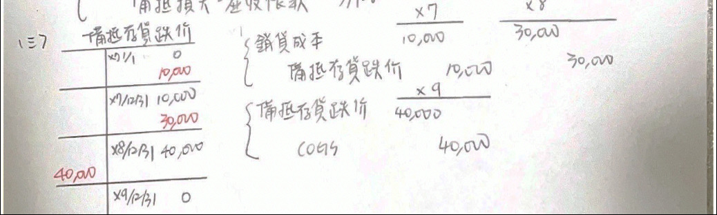 ⑶甲公司成立於 X7 年初,公司存貨紀錄採用永續盤存制。X7 年至 X9 年 各年底存貨成本分別為$300,000,$450,000,$550,000;X7 年至 X9 年 各年底淨變現價值分別為$290,000,$410,000,$600,000。甲公司存貨採 成本與淨變現價值孰低衡量。 試作:X7 年至 X9 年各年底有關存貨採成本與淨變現價值孰低衡量之 分錄(假設甲公司沒有作迴轉分錄)。(6 分)