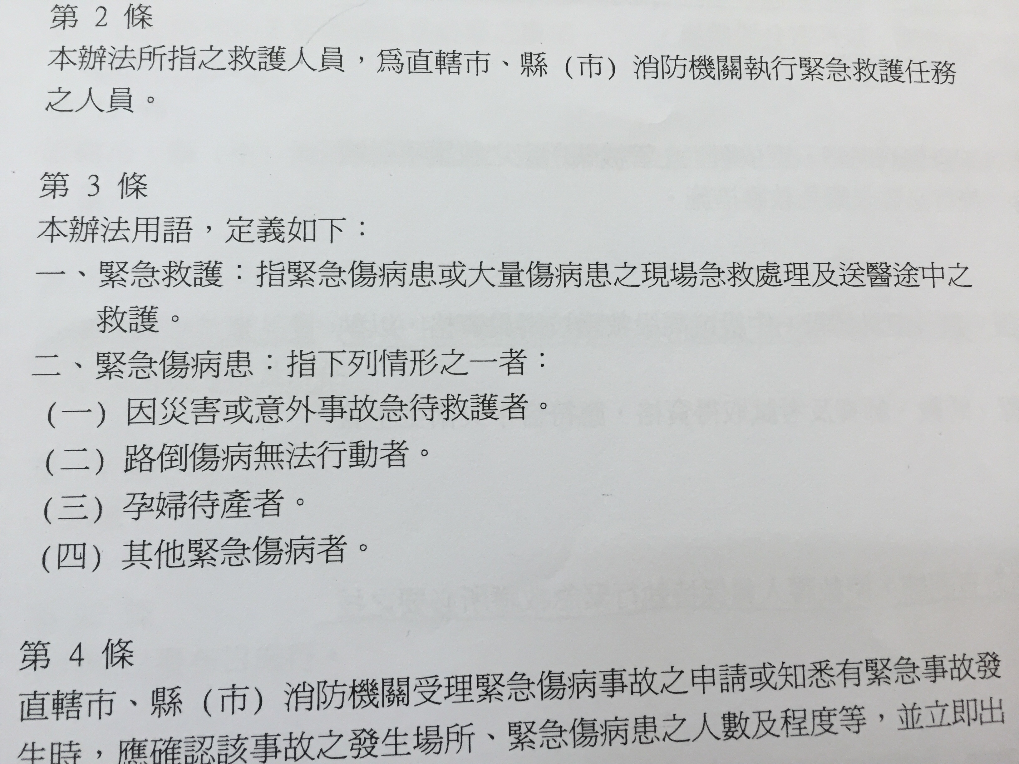 一、緊急傷病:指具有急性及嚴重性症狀,如未即時給予醫療救護處理, 將導致個人健康、身體功能嚴重傷害或身體器官機能嚴重異常之傷病 。 二、緊急傷病患:指緊急傷病之患者。但不包括醫院已收治住院者。 三、大量傷病患:指單一事故、災害發生之傷病患人數達十五人以上,或 預判可能達十五人以上者。 四、重大傷病患:指傷害或疾病狀況具生命威脅之危險,需專業醫療團隊 予以立即處置者。 五、離島、偏遠地區難以診治之傷病患:指依該離島、偏遠地區之醫療設 備、設施及醫事人員能力,無法提供適切治療者。