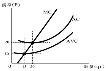 (其中q i 為個別廠商的產量)。每一家個別廠商的平均成本(AC)、 變動成本(AVC)及邊際成本(MC)的圖形如下圖。此一完全競爭廠商所生產的商品,潛在需求者非常眾多,每一位潛在需求者的需求函數為