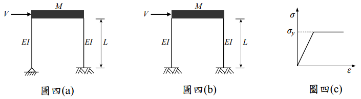 四、圖四(a)及圖四(b)皆為剛性樓版構成的剪力房屋,剛性樓版總質量為 M,柱為鋼柱, 材料性質如圖四(c)所示,柱斷面為邊長 b 的正方形,EI 值為常數,不考慮柱的質量。 試分析: