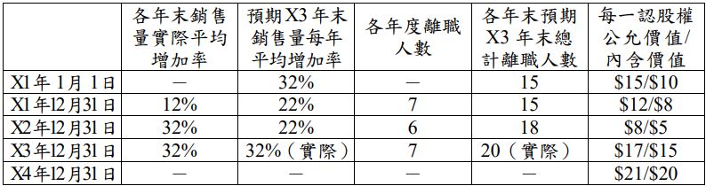 三、X1 年1 月1 日,甲公司給與100 位員工認股權。若員工未離職,且特定產品之銷售量每年平均至少增加 10%,則該認股權將於第 3 年底既得,而員工可以在 X4 年初至 X5 年底的 兩個年度中執行既得之認股權。X4 年年底,有30 名員工執行全部之認股權,另外50 名獲 得認股權之員工尚未執行任何認股權。給與每位員工之認股權數量之規定如下:
