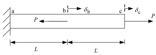 三、如圖所示之軸桿件,長 2L,斷面積為 A,楊氏係數為 E,於 b 點及 c 點各受一力 P 作用,試求: