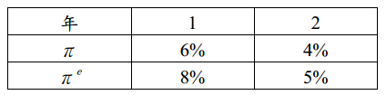 為預期物價膨脹率,u為實際失業率,U為自然失 業率。其歐肯法則(Okun’s Law)為失業率提高1%將使其實際產出偏離其充分就業產 出水準2%。如果該經濟體央行考慮執行一個為期2年的反物價膨脹政策且其執行情況 如下: