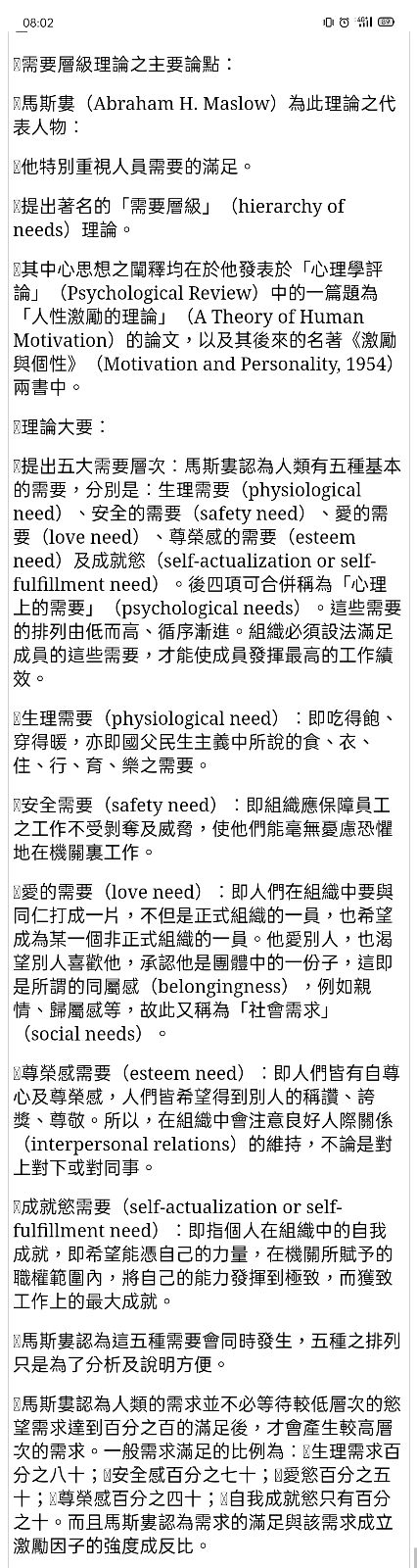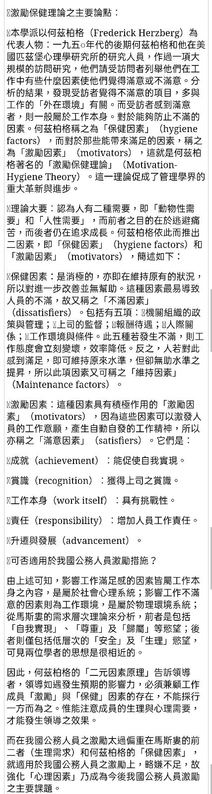 一Maslow的需求層級理論 1生理 2安全 3社會 4愛隸屬 5自我實現 二激勵保健理論 1激勵因素 2保健因素 三上述兩理論試用於我國公務人員之激勵措施