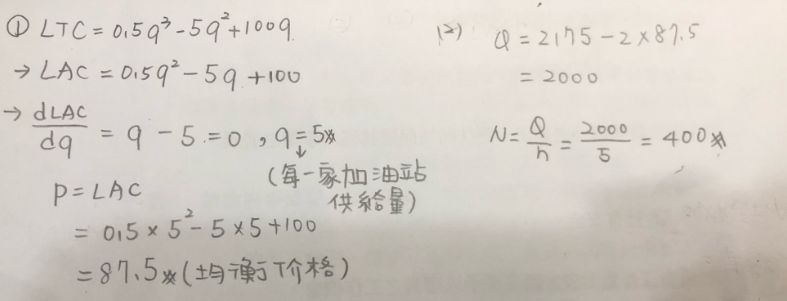長期均衡時利潤為零,P=min LAC, LAC=LTC/q=0.5q^2-5q+100, 對LAC微分>q-5=0,q=5(每一加油站供給量) P=0.5*5^2-5*5+100=87.5(市場均衡價格) Q=2,175-2*87.5=2,000 N=2,000/5=400(家數) 這樣?
