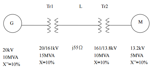 一、某三相電力系統的單線圖如圖一所示,請以電動機(M)側的額定值為基準,分別求出: