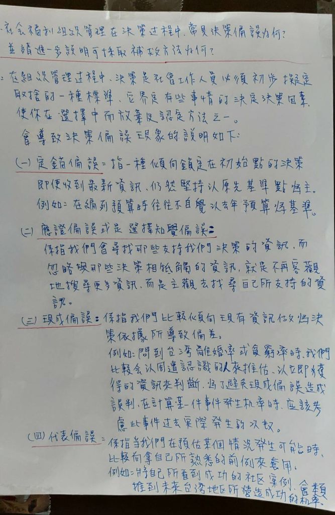 一、社會福利組織管理者在決策過程中,常見的決策偏誤為何?並請進一步 說明可採取的補救方法為何?(25 分)