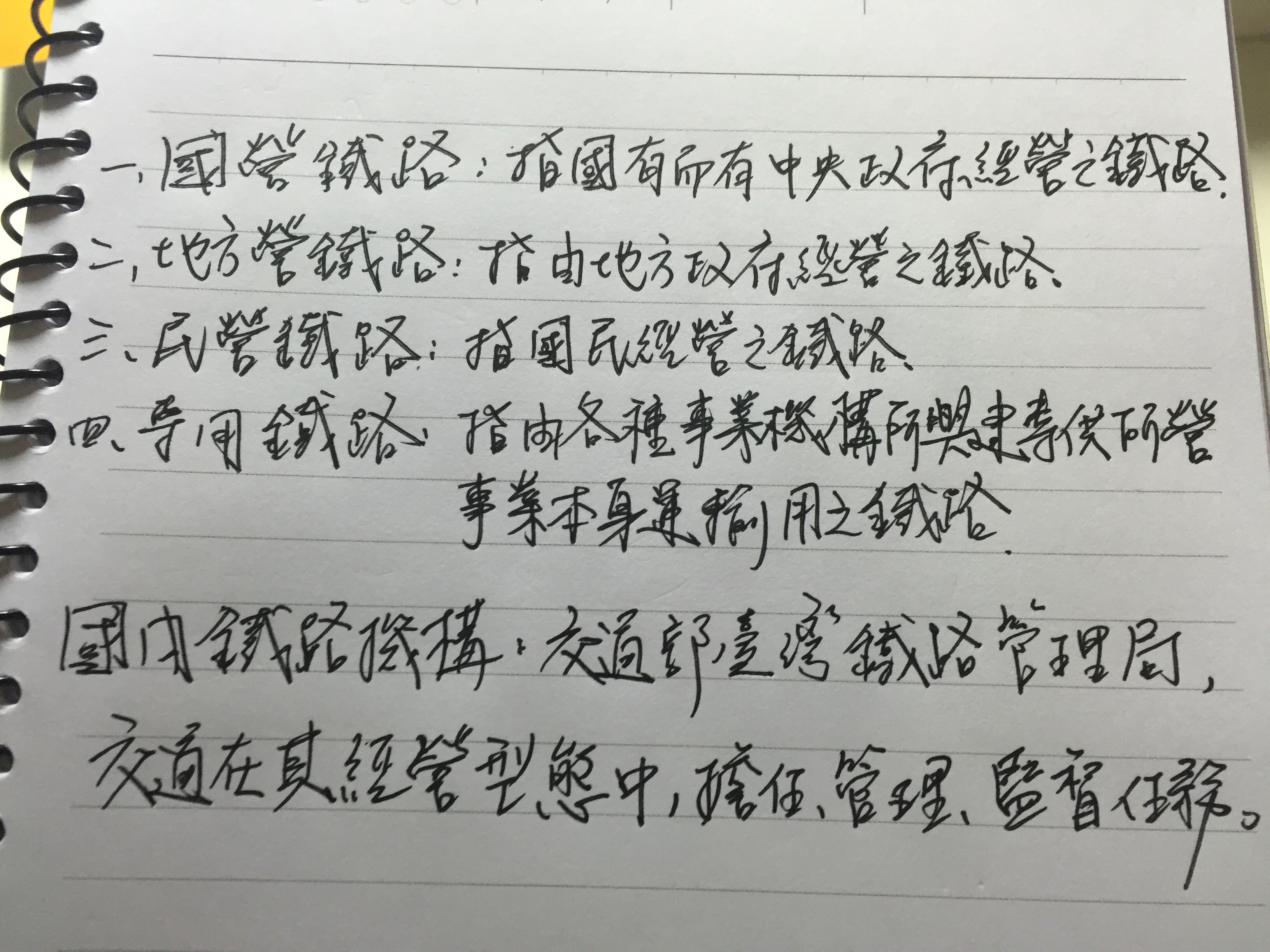 1. 國營鐵路:指國有而由中央政府經營之鐵路,如交通部鐵路管理局。依鐵路法第4條規定,國營鐵路,由交通部管理。