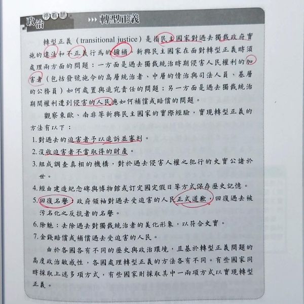 綜上所述,轉型正義泛指針對歷史上政府對於人民的侵害實施賠償及彌補,