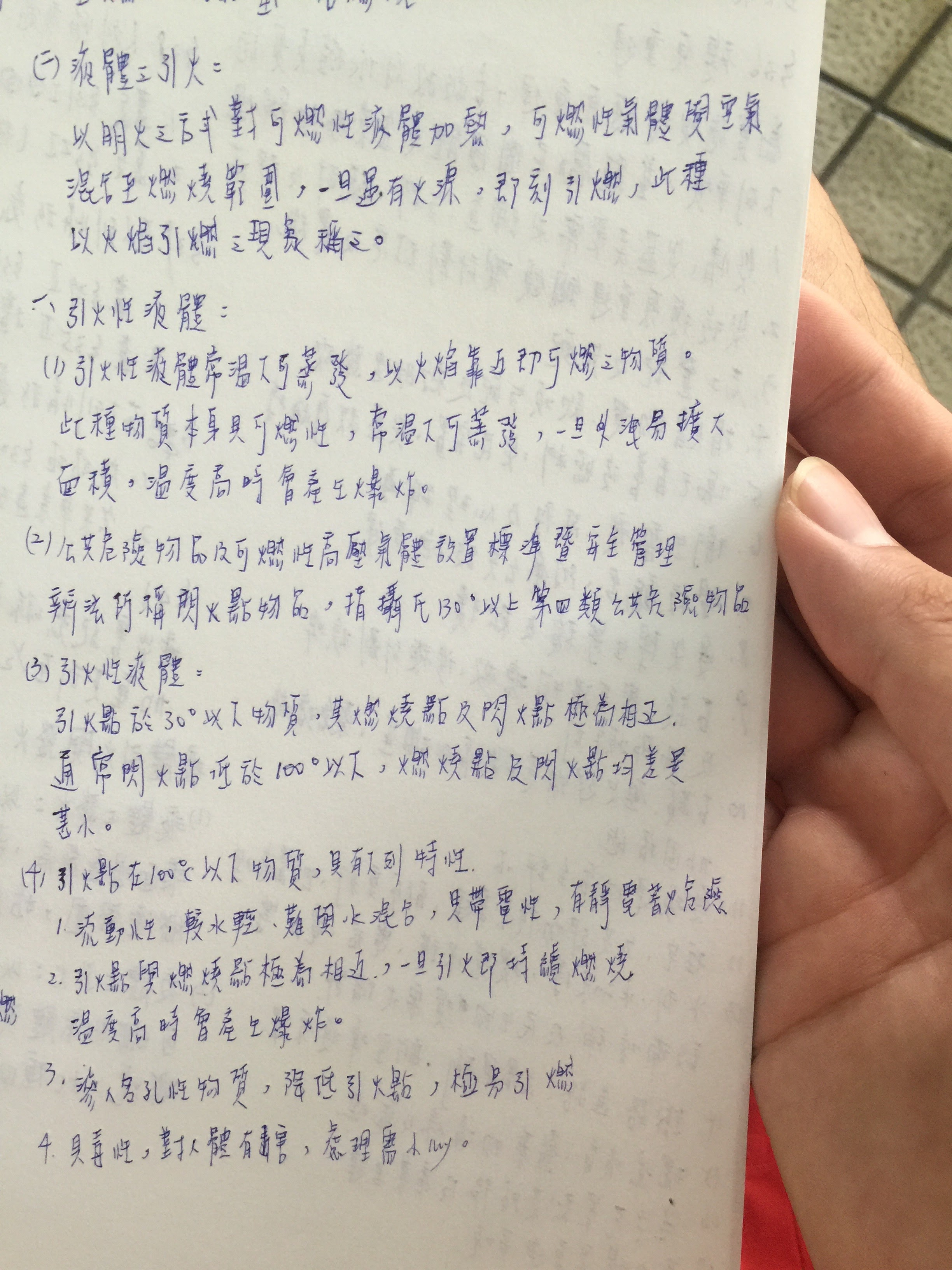 ㄧ. 何謂液體之引火與發火: (ㄧ)液體之引火的定義:係指以明火的方式,如火焰直接對可燃性液體加熱,可燃性氣體若與空氣混合達燃燒範圍時, 一旦遇有點火源,便會即刻引火燃燒,此種經點火源點燃而起燃燒之現象稱之 (二)液體之發火的定義:以非明火的方式(間接熱源)對可燃性液體加熱,液體溫度越高,蒸氣便越多,可燃性氣體若 與空氣混合達到燃燒範圍時,即燃燒之現象稱之。二.引火性液體與高閃火點液體之特性: (ㄧ)引火性液體特性:引火點在攝氏三十度以下之可燃性液體,謂之。引火點低之物質,其燃燒點與閃火點之差異較小 (約為五度左右)。 (二)高閃火點液體特性:閃火點高之物質,其燃燒點與閃火點差別較大 (三)引火點在攝氏一百度以下的可燃性液體之特性: 1.富有流動性,與水難混合,具有帶電性,有靜電著火之可能。 2.引火點與燃燒點接近,一旦引火即持續燃燒,燃燒溫度過高時,可能產生爆炸。 3.若滲入多孔性物質時,因有良好的斷熱及保溫效果,因此即使溫度低於引火點,亦即易引燃。 4.具毒性,對人體有害,處理時需小心。
