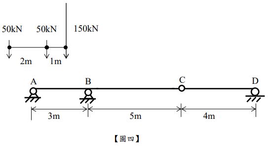 三、如【圖四】所示為可雙向通行之梁且C點為鉸接,當一車輪組荷重行駛過該梁時,試求梁中B點之最大彎矩及C點之最大剪力。