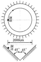 三、有一夾角90°、左右對稱之圓錐槽,槽面光滑且不計鋼球與槽面間之摩擦,若鋼球於槽內作等速率圓周運動,且其球心軌跡為直徑2000cm之水平圓周,試求鋼球速率應維持多少m/sec? (g=10m/sec²)